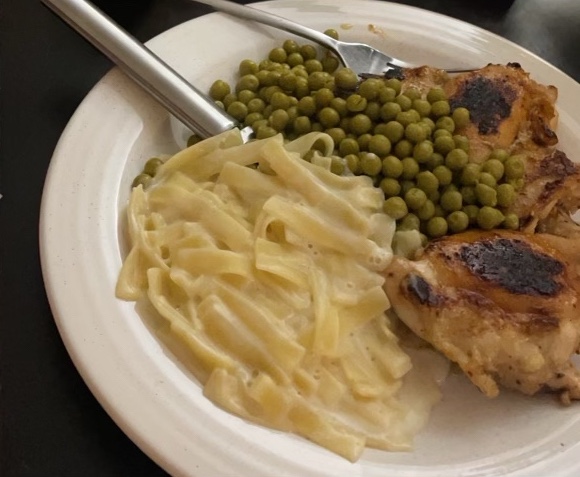 Another easy dinner option is the grilled chicken thigh with your seasoning preference, peas, and some noodles with homemade butter garlic sauce. Totaling out macro wise to be: 42g carbs, 10g fat, 33.8g protein. All of the calculations were done using the MyFitnessPal app and adding in the correct food, food amount, and brand for accuracy.